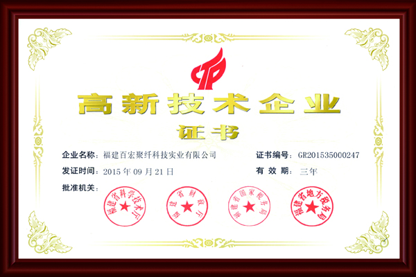 近日,福建百宏聚纤科技实业有限公司通过了省科技厅、财政厅、国家税务局、地方税务局组织的高新技术企业的认定,再次荣获“高新技术企业”证书。