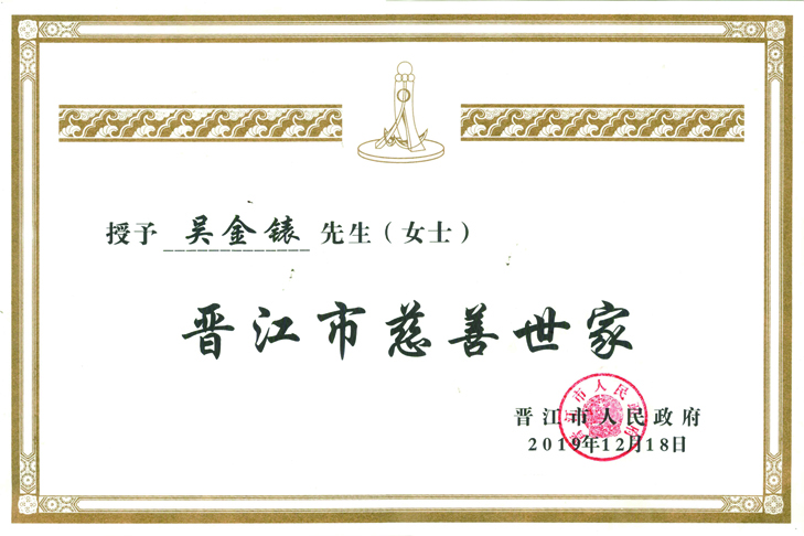 百宏实业总裁吴金錶先生 获授“晋江市慈善世家”、 晋江慈善总会“永远荣誉会长”