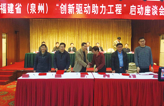 此次調研後,在3月15日的泉州“創新驅動助力工程”啟動座談會上,泉州市6家民營企業分別與全國學會簽約。其中,我集團副總裁葉敬平,品牌部主任陳阿斌代表公司與中國紡織工程學會、中國自動化學會簽訂合作協議。
