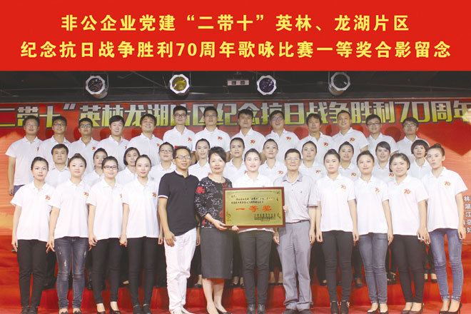 2015年9月3日,是中國首個法定的“餩餩中國人民抗日戰爭勝利紀念日”。銘記曆史、緬懷先烈、珍愛和平、開創未來,9月1日晚,非公企業黨建“二帶十”英林、龍湖片區紀念抗日戰爭勝利70周年歌詠比賽在勁霸集團隆重舉行,來自各片區的9家企業黨組織代表隊參加了比賽。晉江市委組織部領導洪肇堆、英林鎮領導蔡永革、王壽權,龍湖鎮領導莊銘德,勁霸公司董事局主席洪肇明,片區黨建指導員楊煌程、黨建幹部蘇明山,百宏公司黨委葉敬平及各企業黨支部領導出席並全程觀看比賽。