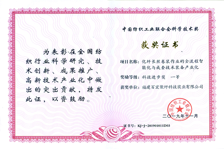 福建百宏聚纖科技實業有限公司“化纖長絲卷裝作業的全流程智能與成套技術裝備産業化”項目榮獲“科學技術獎 科技進步獎 一等獎”。